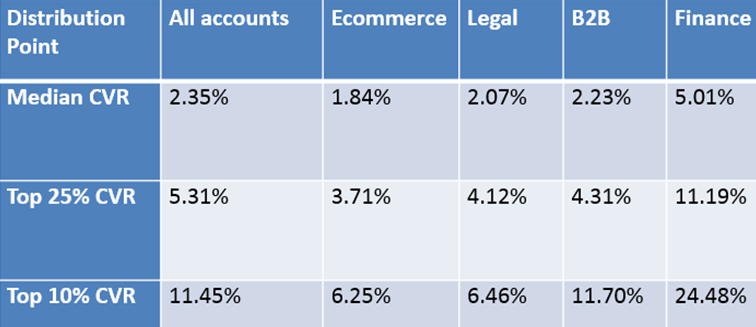 After seeing the above mentioned chart, it becomes very clear that if you have finance related website chances of having a conversion rate of 10% or above is very high but if you have an e-commerce website 2% to 4 % conversion will considered as a great conversion rate.